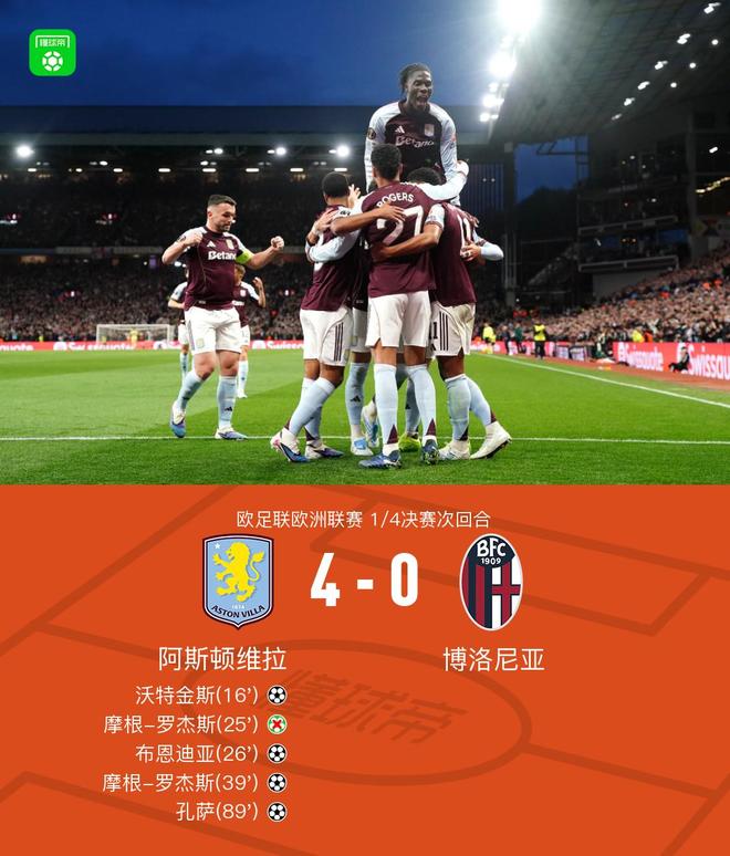 北京时间4月17日欧足联欧洲联赛 1/4决赛次回合,阿斯顿维拉对阵博洛尼亚。上半场沃特金斯首开记录,罗杰斯失点,布恩迪亚破门再下一城,罗杰斯将功补过破门扩大比分。下半场孔萨破门锁定胜局。最终比分阿斯顿维拉 4-0 博洛尼亚。两回合总比分阿斯顿维拉7-1博洛尼亚晋级。
