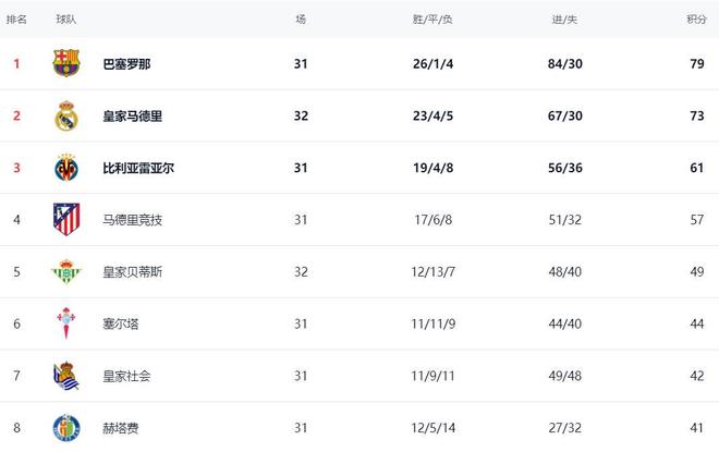 在积分榜上,巴萨占据榜首位置:26胜1平4负,拿到79分。皇马赢球之后,战绩变成23胜4平5负,拿到73分,排名第2,落后巴萨6分。而且,皇马比巴萨多踢1场,争冠前景不容乐观。比利亚雷亚尔以61分排名第3。第4的是马竞,只拿到57分。皇家贝蒂斯赢球之后,总积分达到49分,排名第5。第6的是塞尔塔,只拿到44分。