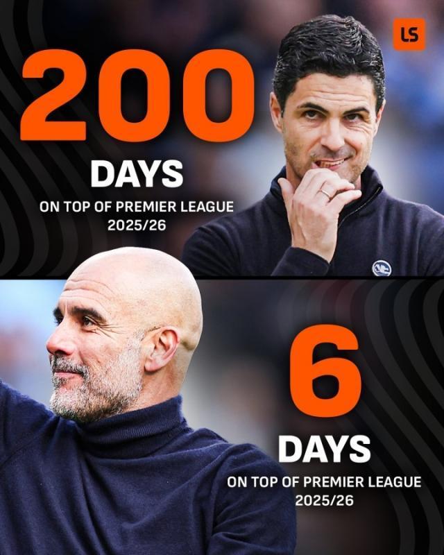 枪手本赛季占据榜首达200天 曼城11天抹平差距登顶